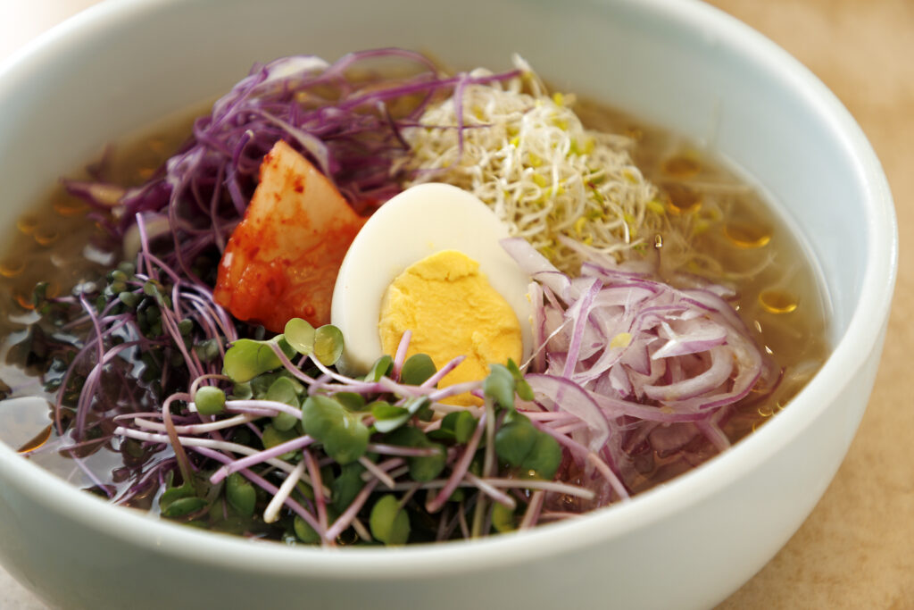 また、さっぱりとしたい日のランチメニューには、韓国式の冷麺もおすすめ。色とりどりのスプラウトや、発酵食品のキムチなどがトッピングされ、栄養もビジュアルも満点! 鶏と煮干しでとった、奥行きのある味わいのスープと、そば粉で作られた韓国式の繊細で喉ごしの良い麺が見事にマッチしている。