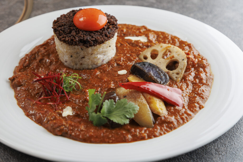 カレーと麻婆豆腐、どちらにも雑穀米がセットされ、ラム肉のそぼろと卵黄をトッピング。まろやかな卵黄はピリ辛味の料理と相性が抜群だ。
