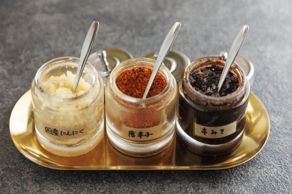 煮込む前の状態でいったん運ばれたタッカンマリは、目で楽しんだあと、厨房でちょうど良い頃合いに煮てから再度サーブされる。ほろほろにやわらかく煮た骨つきの丸鶏は、スタッフが切り分けてくれるので、とても食べやすい。そのままでも滋味深い味わいだが、酢醤油のたれや、白髪ネギヤンニョムなどの薬味で“味変”しながら食べても絶品だ。