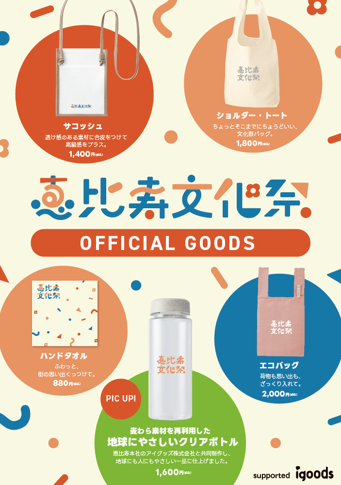 グッズを共同制作するのは、恵比寿に本社をおいて昨年出展をしたアイグッズ株式会社。エコバッグや地球にやさしいクリアボトルなど、思い出と使いやすさを兼ね備えた5種類を恵比寿文化祭インフォメーションテントで販売する(坂道のプロムナード上 )。